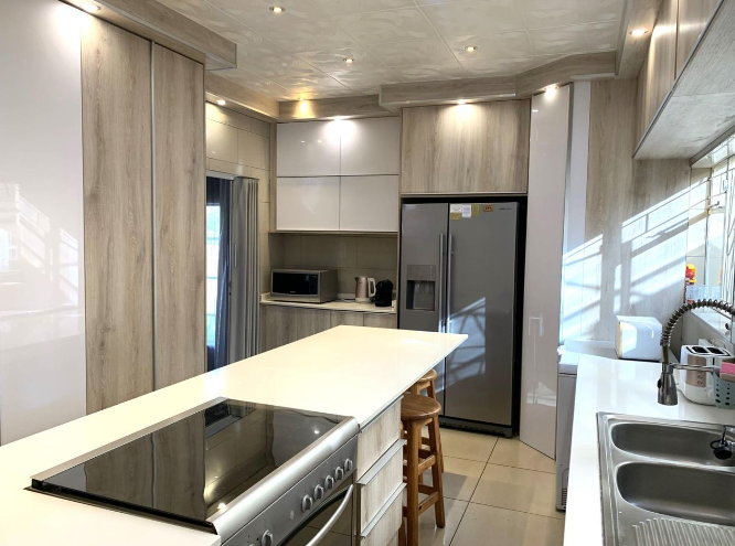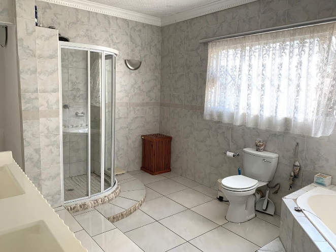 The lounge is large, tranquil and serene and is very suited to relaxed visits with guests or family. The spacious TV room is adjacent to the covered Lapa, which has a jacuzzi as well as a built-in braai. The door leads onto the swimming pool and established garden at the back.